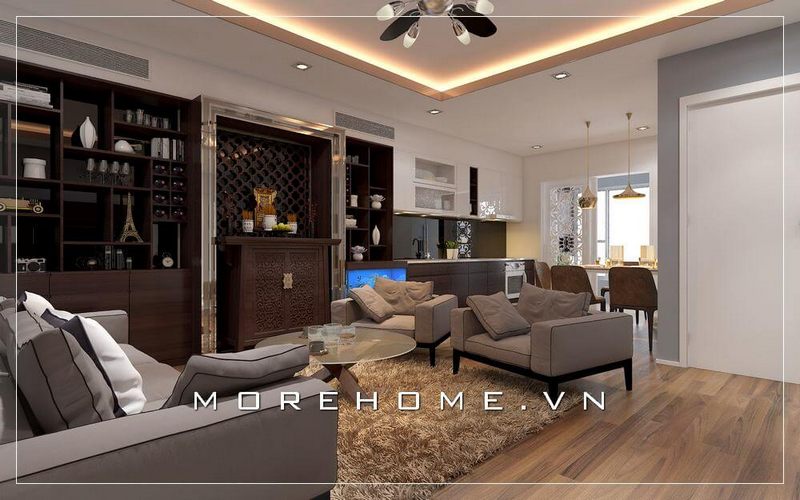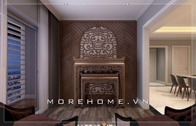 Ấn tượng với mẫu bàn thờ gỗ tự nhiên hiện đại được đặt trong phòng khách, biến căn phòng khách chung cư trở nên tâm linh vừa có tính trang trí thẩm mỹ cao.