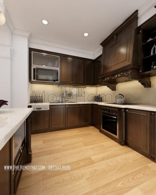 Thiết kế nội thất phòng bếp tân cổ điển sang trọng, tinh tế mang đến không gian nấu nướng tiện nghi cho người nội trợ