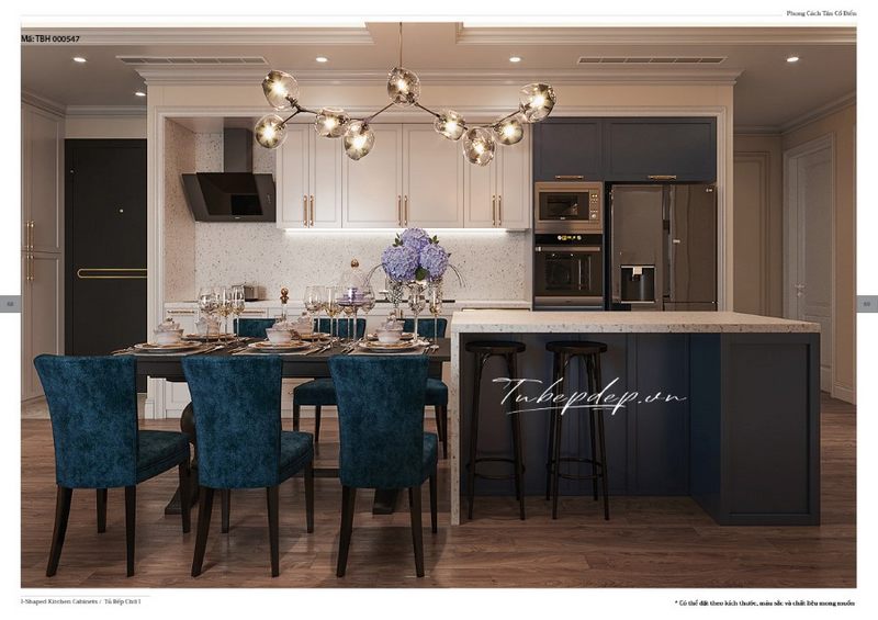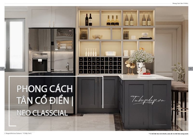 Ngắm nhìn mẫu thiết kế nội thất bếp tân cổ điển sang trọng kiểu dáng chữ L bắt mắt và tiện nghi dành cho không gian bếp chung cư, nhà phố, biệt thự.