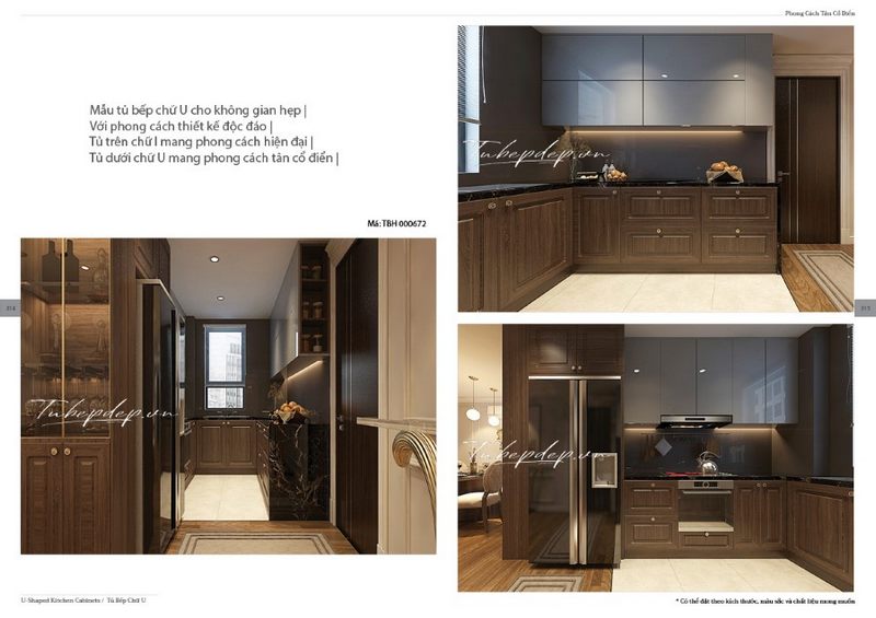 Mê mẩn mẫu thiết kế phòng bếp tân cổ điển kết hợp sáng tạo giữa tủ bếp chữ L trên và tủ dưới chữ U từ gỗ óc chó vừa sang trọng lại tiết kiệm không gian, cất trữ được nhiều đồ hơn