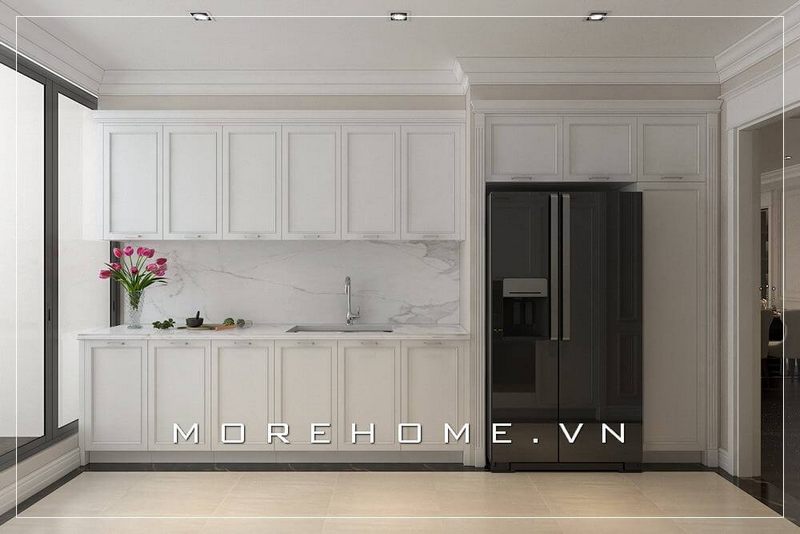Thiết kế nội thất phòng bếp chung cư sang trọng sử dụng tone màu trắng tinh tế, thoải mái cho người nội trợ