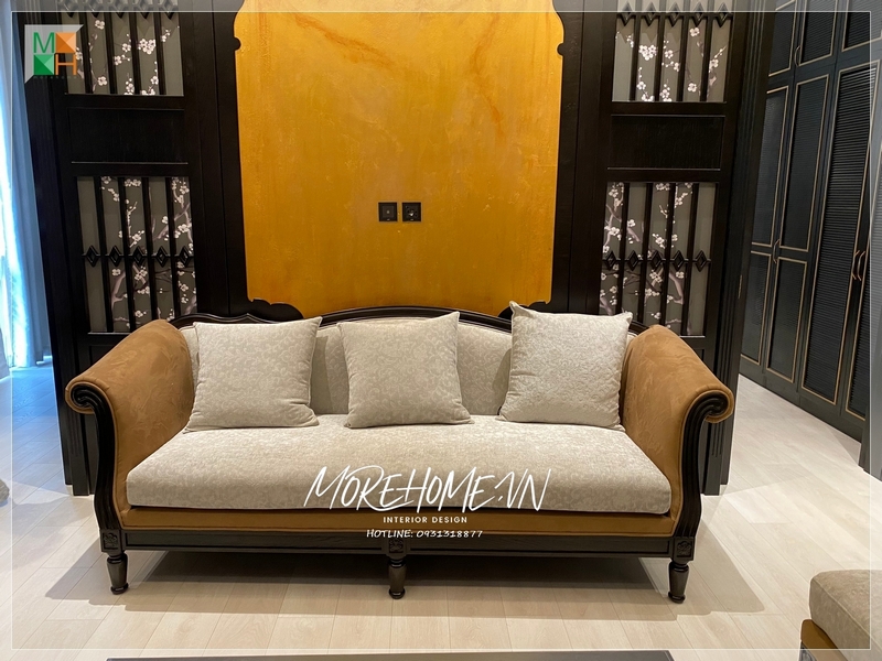 Sofa văng dài có tựa bọc nệm màu nâu phong cách Indochine sẽ làm cho không gian sống của bạn thoải mái, tiện nghi và thẳm mỹ hơn khi thi công.