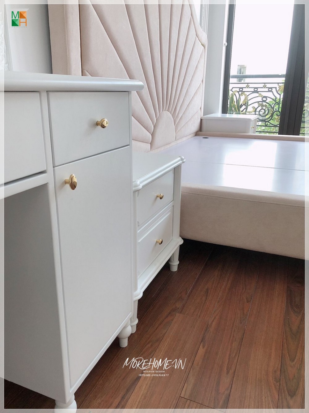 Kệ ti vi tân cổ điển sơn trắng bệt với những chi tiết nhẹ nhàng của hoa kim ngân.
