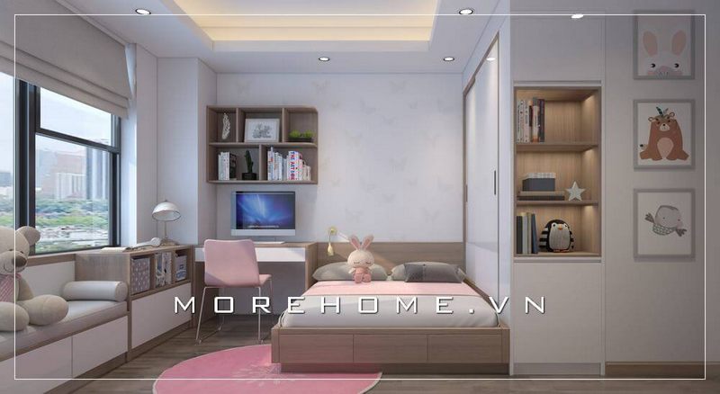 Giường ngủ cho bé có kiểu dáng hiện đại và không có chân, được thiết kế với ngăn kéo bằng gỗ công nghiệp.