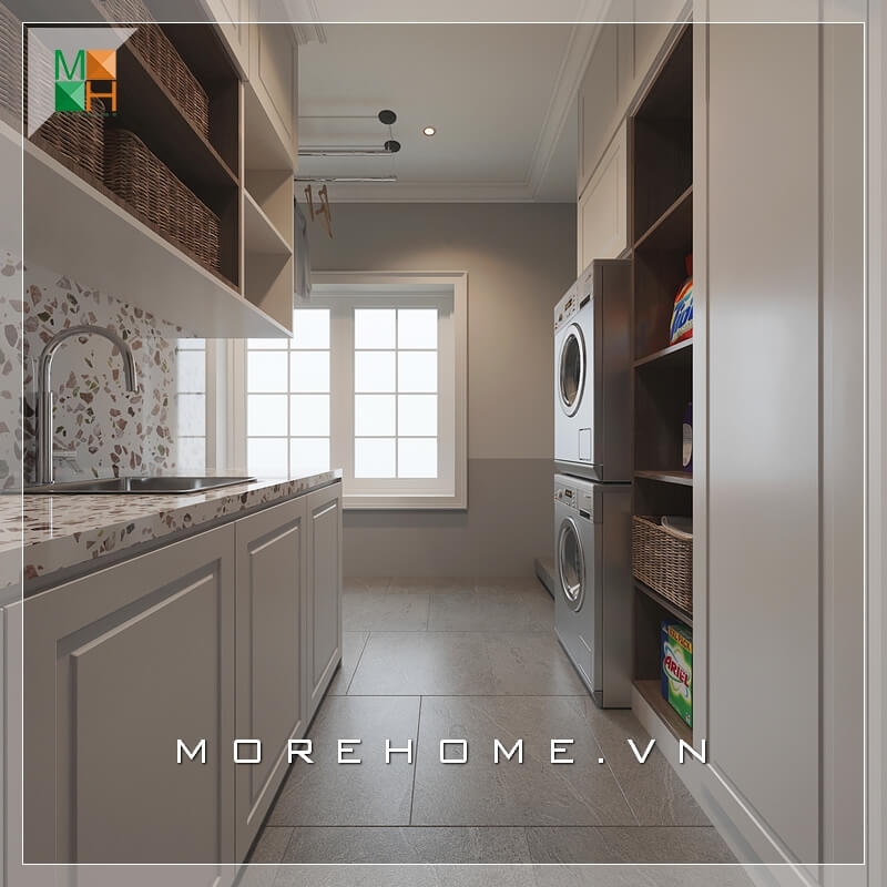 Mẫu thiết kế phòng bếp không gian mở, với hệ thống tủ bếp gỗ kết hợp mặt bàn đá nhân tạo cao cấp với màu trắng - xám, là màu sắc của sự cân bằng, trung tính, mang đến vẻ đẹp sang trọng tinh tế cho không gian phòng bếp