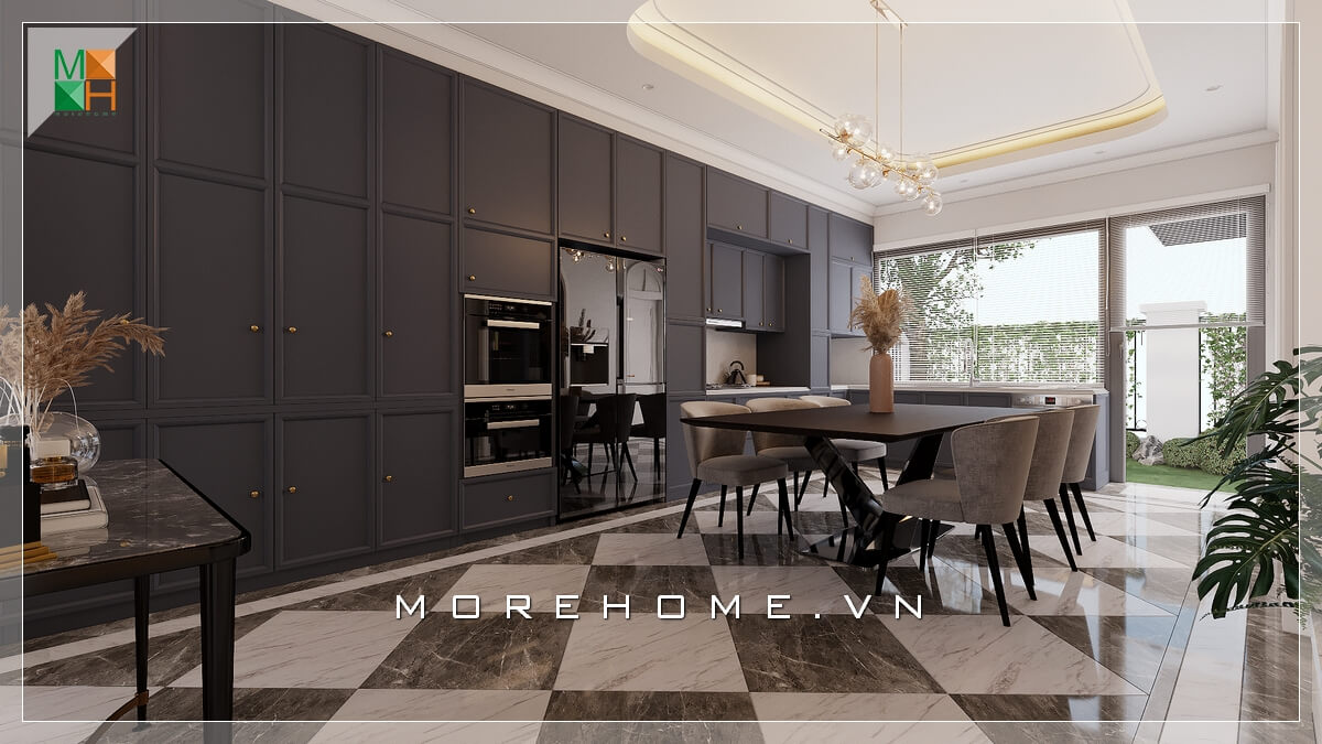 Mẫu thiết kế không gian bếp hiện đại nổi bật với gam màu xám ghi sang trọng cho biệt thự, nhà phố.