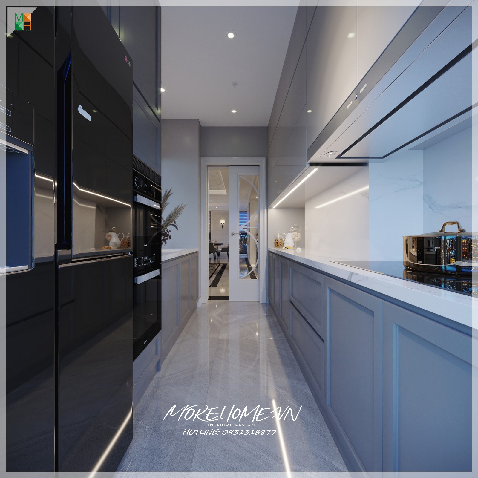 Thiết kế phòng bếp căn hộ chung cư hiện đại tiện nghi với nội thất bố trí vuông vắn, tối giản thoáng đãng cho không gian thêm rộng rãi.